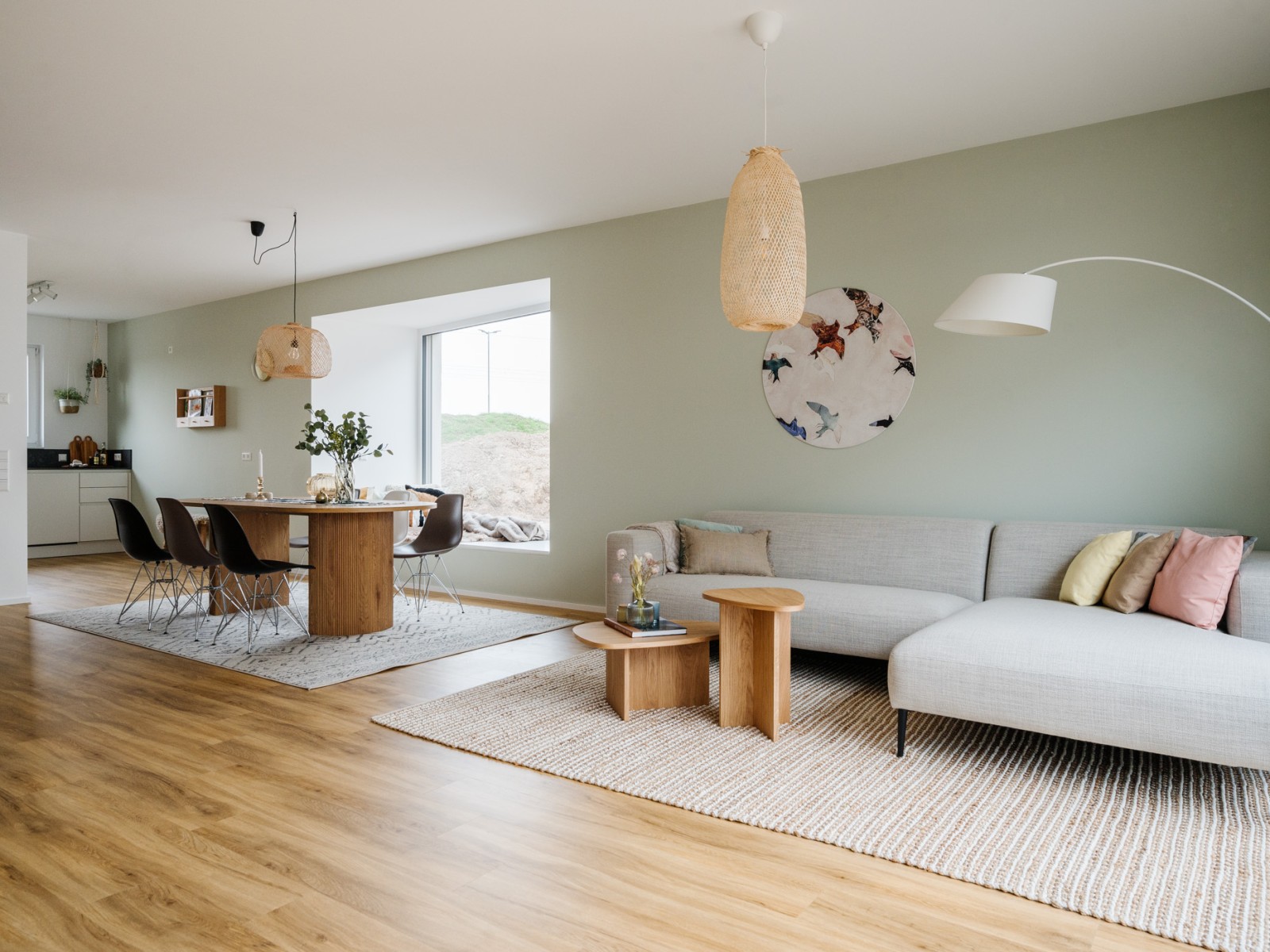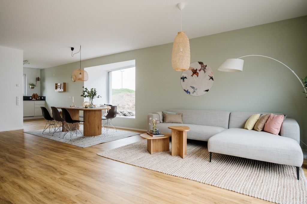 Jalousien unterstützen den sommerlichen Wärmeschutz. Fußbodenheizungen können klimaneutral über die Wärmepumpe betrieben werden. Extensiv begrünte Flachdächer verbessern das Mikroklima und halten Regenwasser zurück.